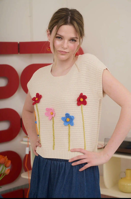 3D Crochet Floral Short Sleeve Sweater Top