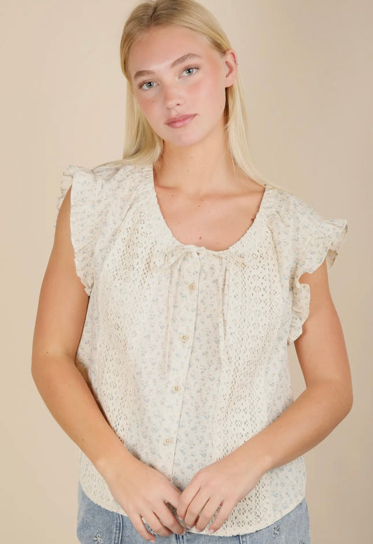 Floral Printed Lace Trim Detail Ruffled Blouse