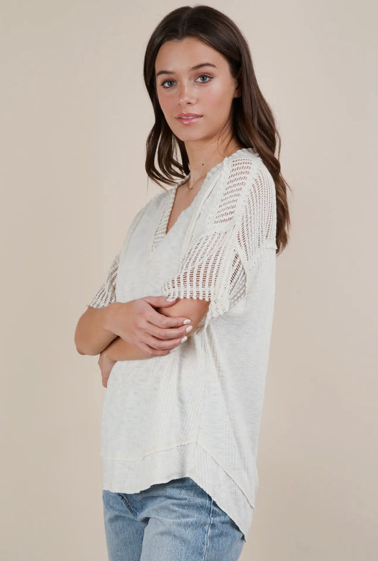 Oversized Contrast Knit Comfy Casual Top - Ivory