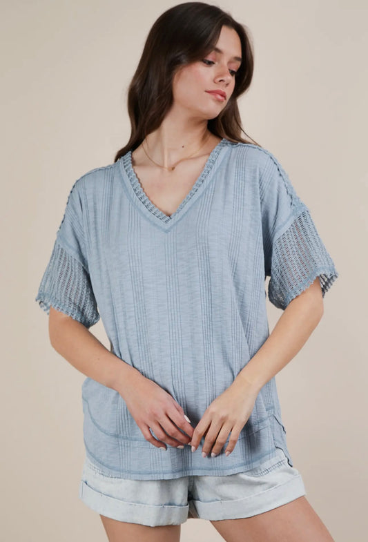 Oversized Contrast Knit Comfy Casual Top - Sky