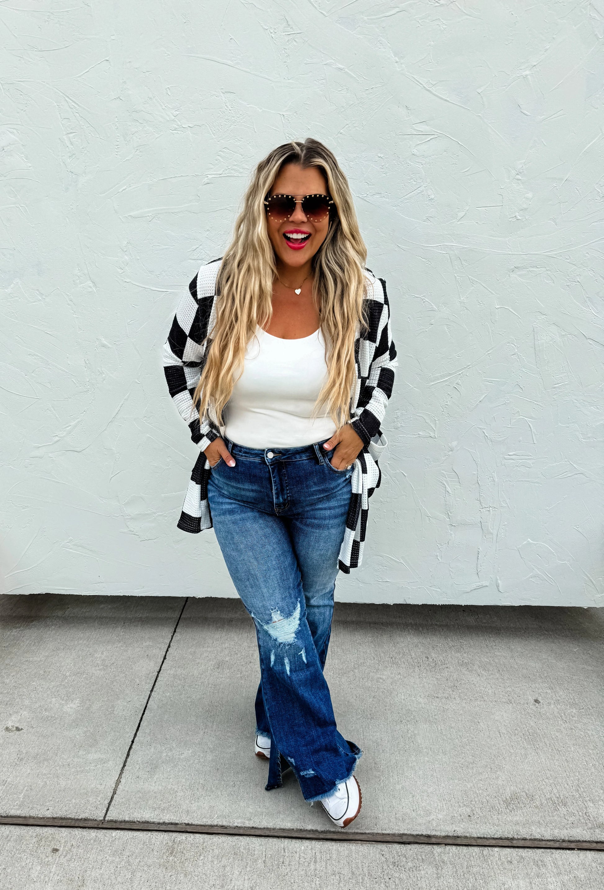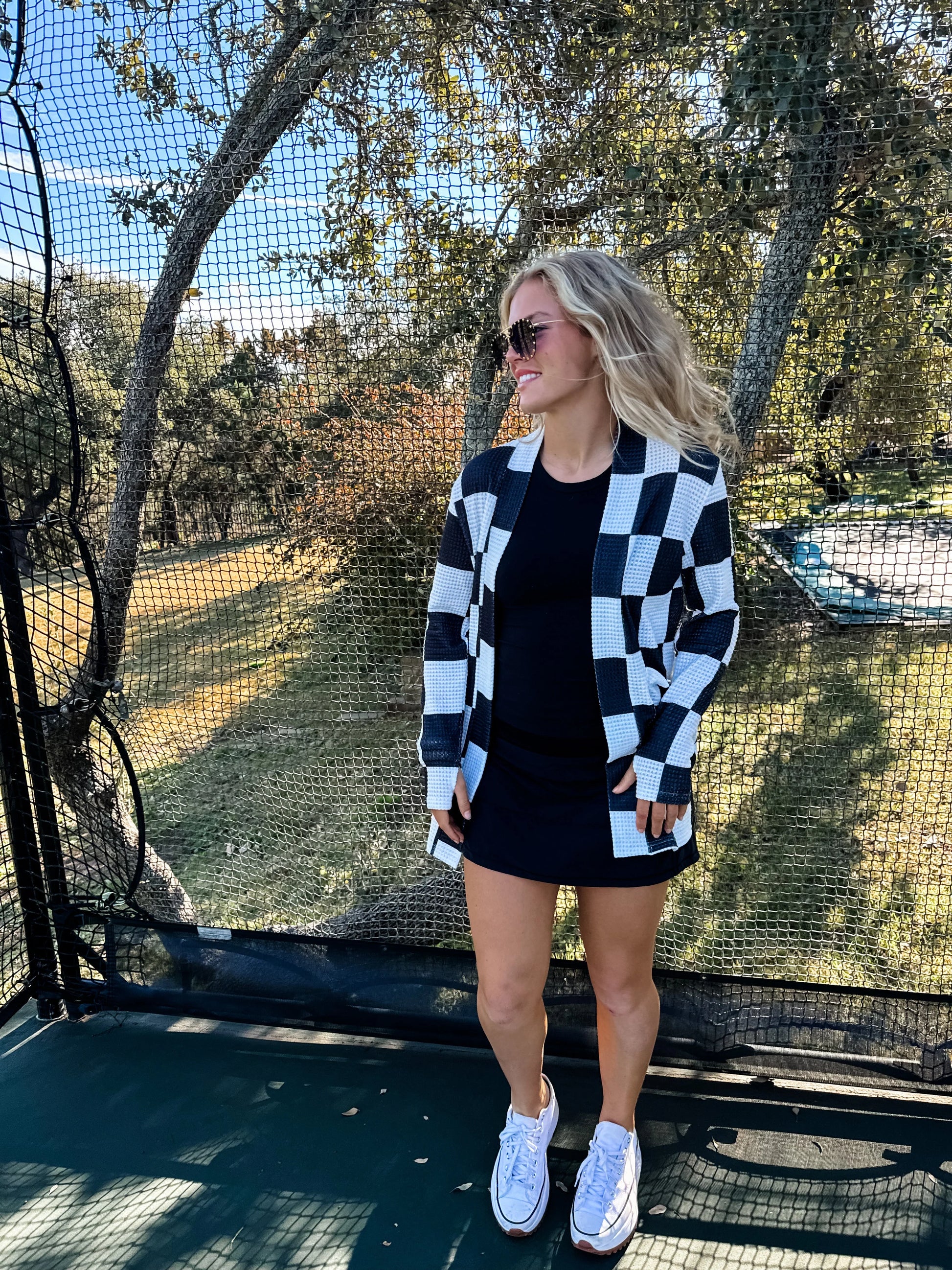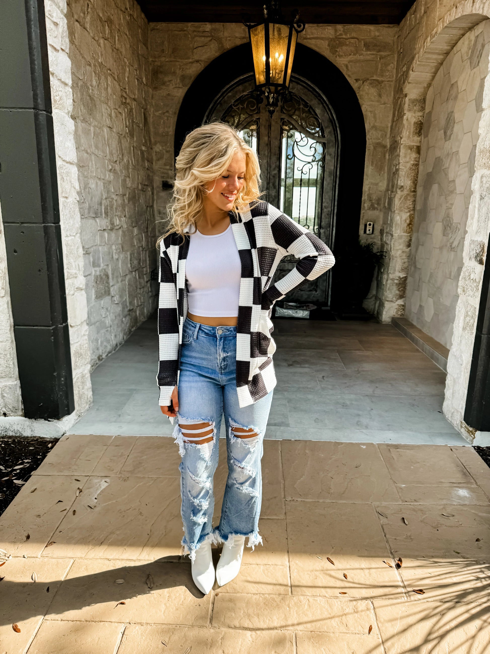 Our popular thumbhole waffle knit cardigan you guys have grown to love are now here in printed checker!