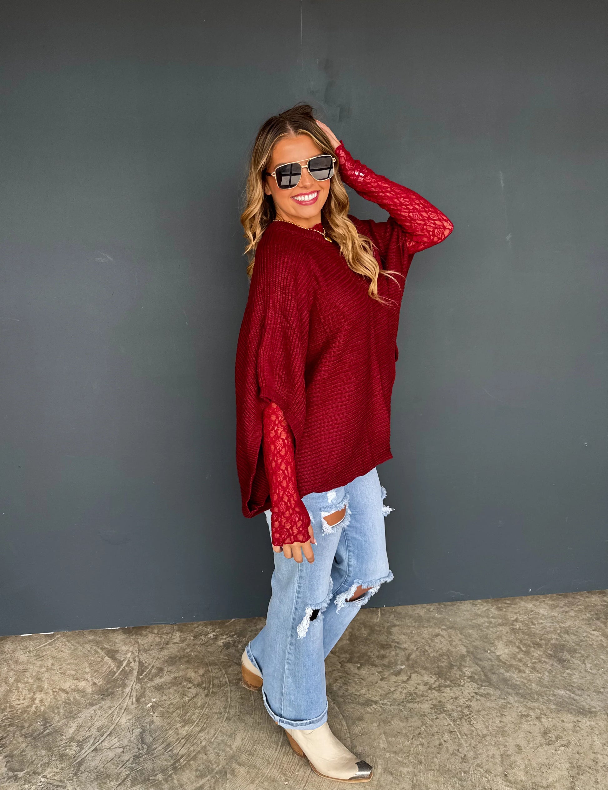 Stay warm and fashionable in this MEG Pullover Poncho. Features long arm holes for a flowy poncho feel, yet in a cute knit sweater. This stylish poncho sweater is designed to keep even the chilliest weather at bay. Perfect for a chic, cozy look.