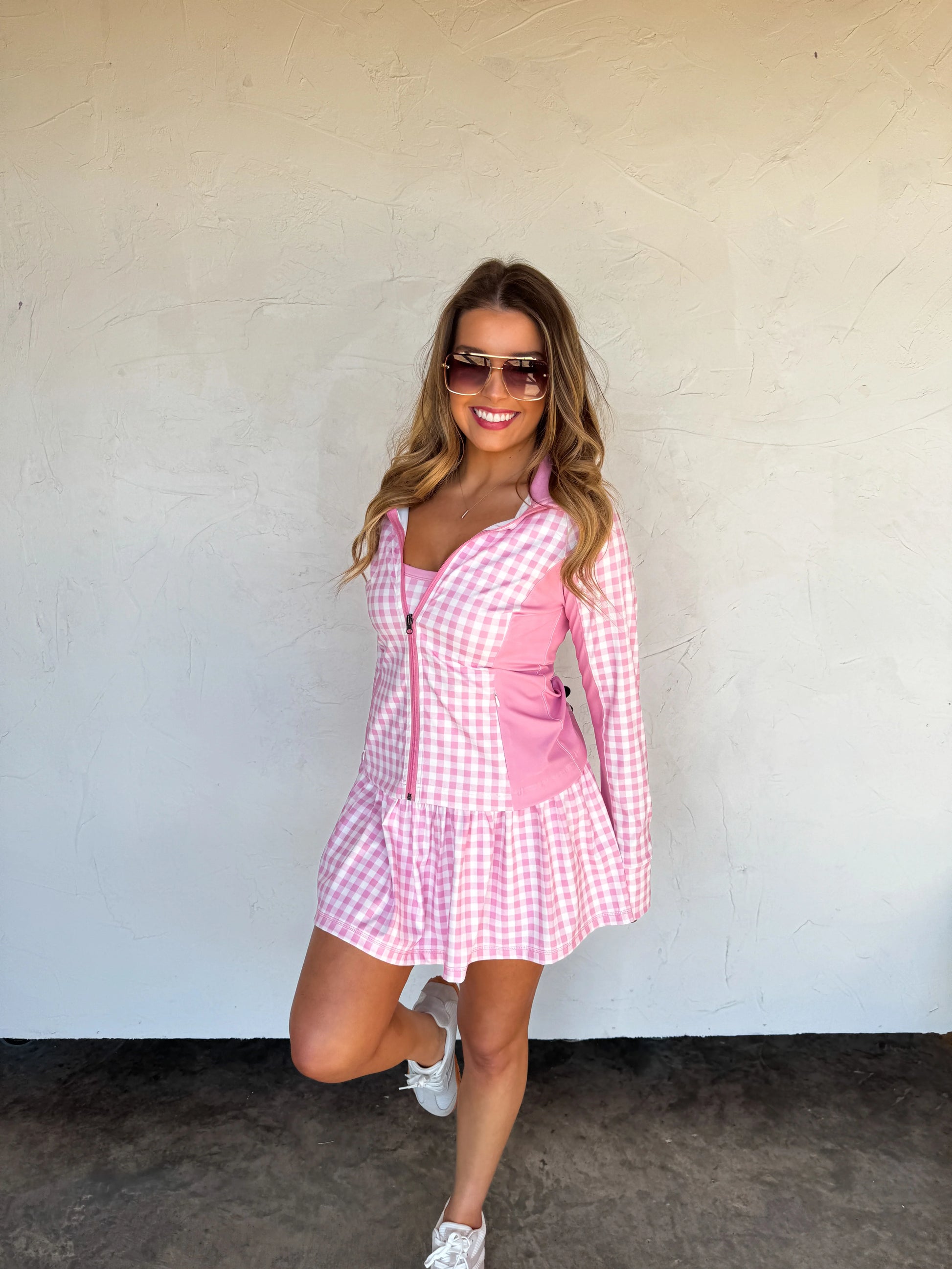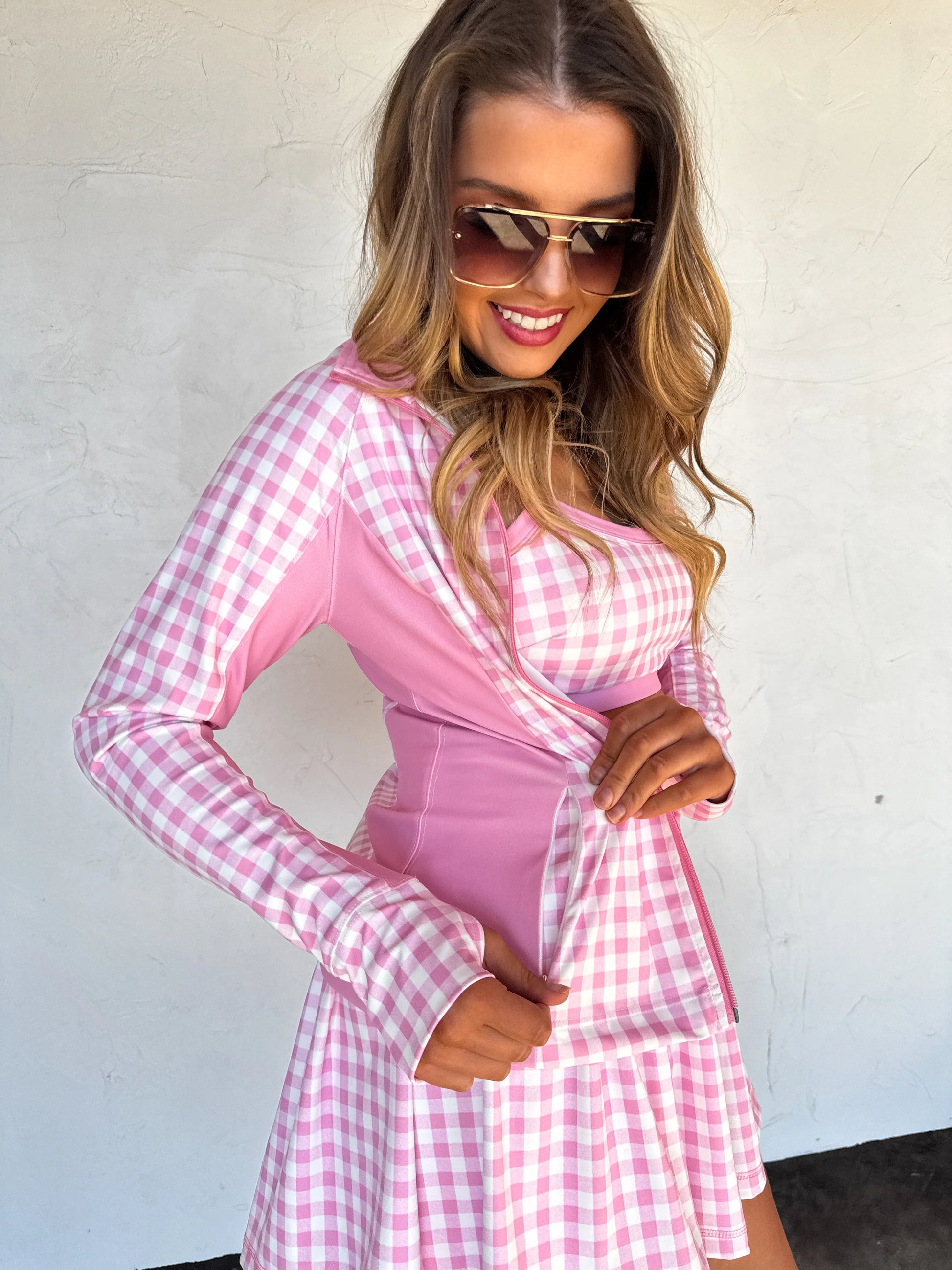 Introducing the OUT THE DOOR ZIP UP JACKET — a versatile and coordinating layering piece that matches our other "Everyday Motion" pieces. Features a charming floral and gingham pattern that effortlessly blends feminine style with casual comfort. The full front zip closure allows for easy on-and-off wear, while dual side zip pockets provide secure storage for your essentials. Features thumbhole cuffs.
