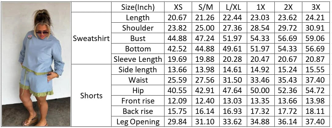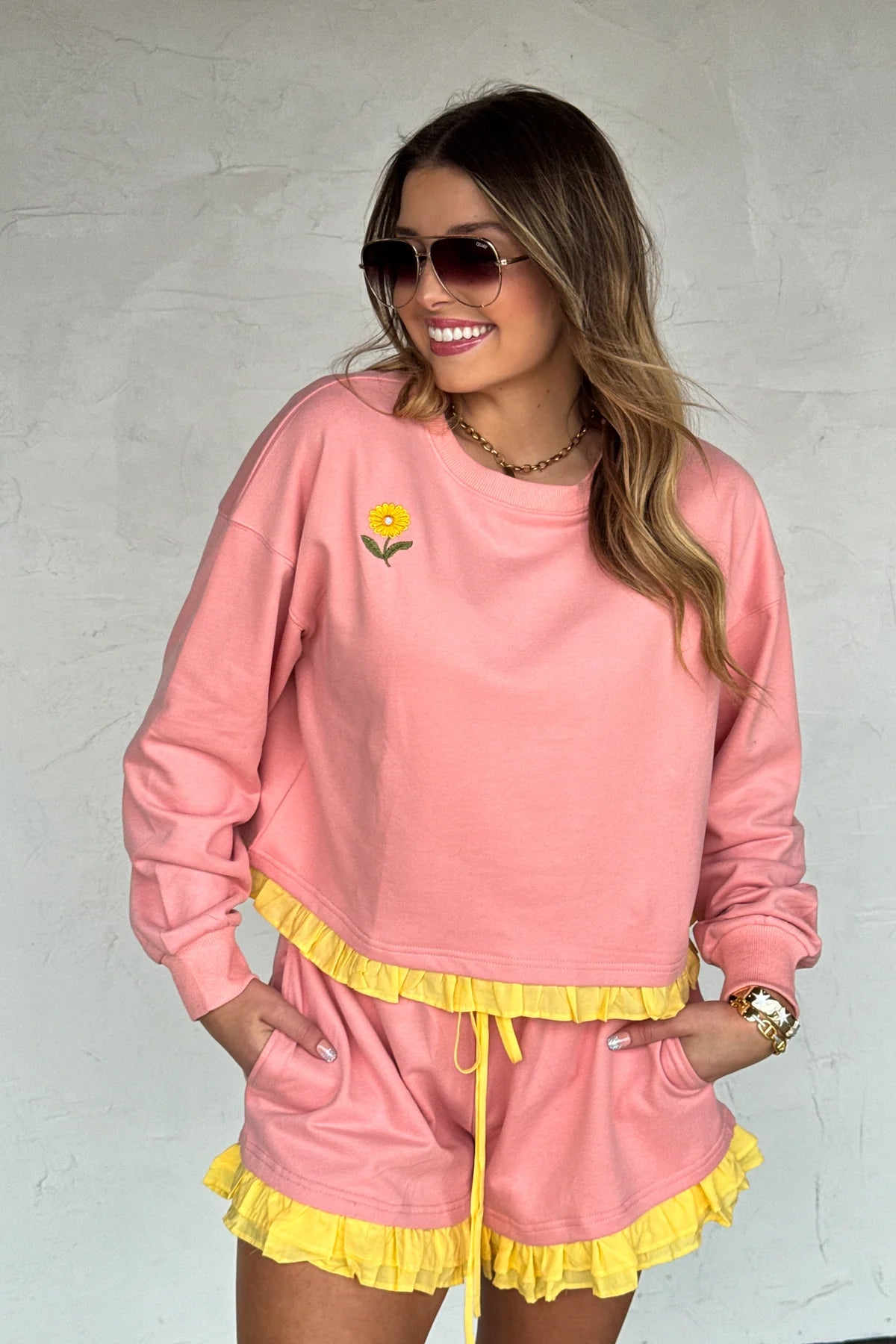 Stay comfy and cute in this ruffle trim short set! This playful two-piece includes a relaxed-fit sweatshirt and matching shorts with contrast ruffle detailing for a fun, feminine touch. Top has embroidered flower detail. Made from soft washed terry cotton fabric giving it a vintage wash look. Perfect for lounging, travel days, or casual outings.