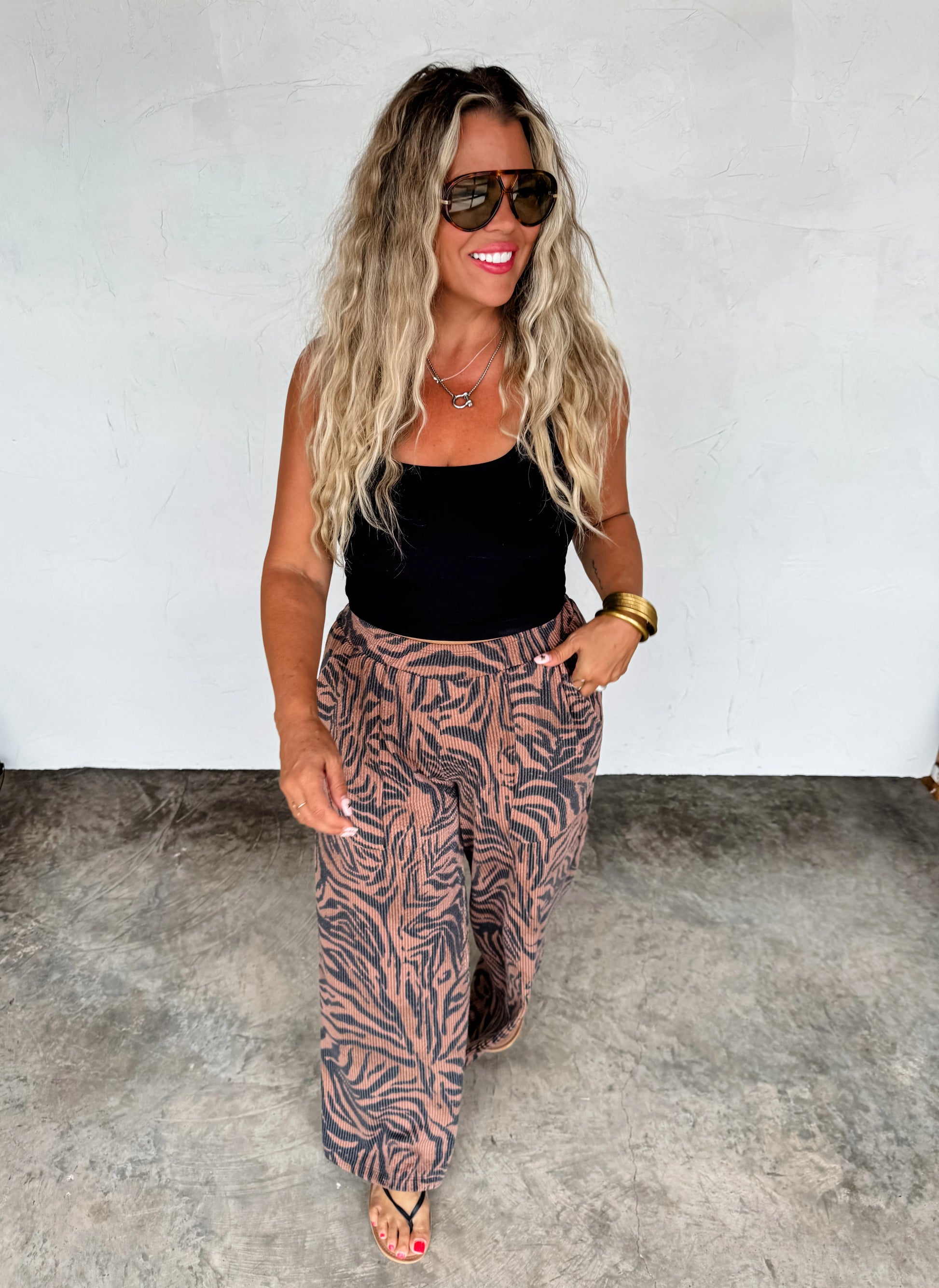 Soft, cozy and so so stretchy! These zebra print ribbed pants are the perfect way to add a "pop" to any outfit!! Features oversized panel pockets, wide legs and elastic waist with faux drawstring. Matching zebra Reese cardigan available on another listing